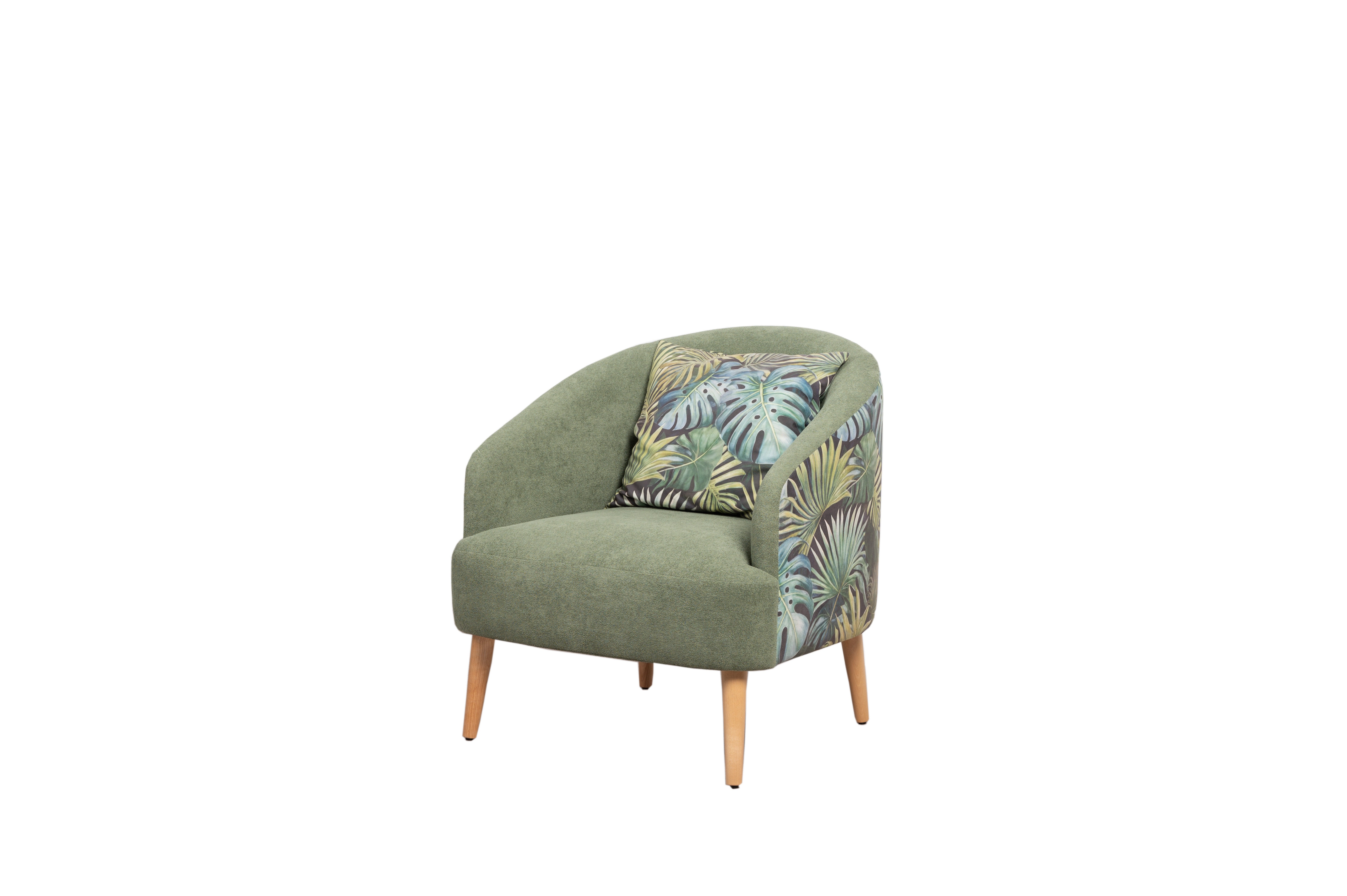 Кресло для отдыха на деревянных опорах. Спинка округлой формы переходящая в боковины. Кресло с подушкой думкой квадратной форы из ткани компаньон.