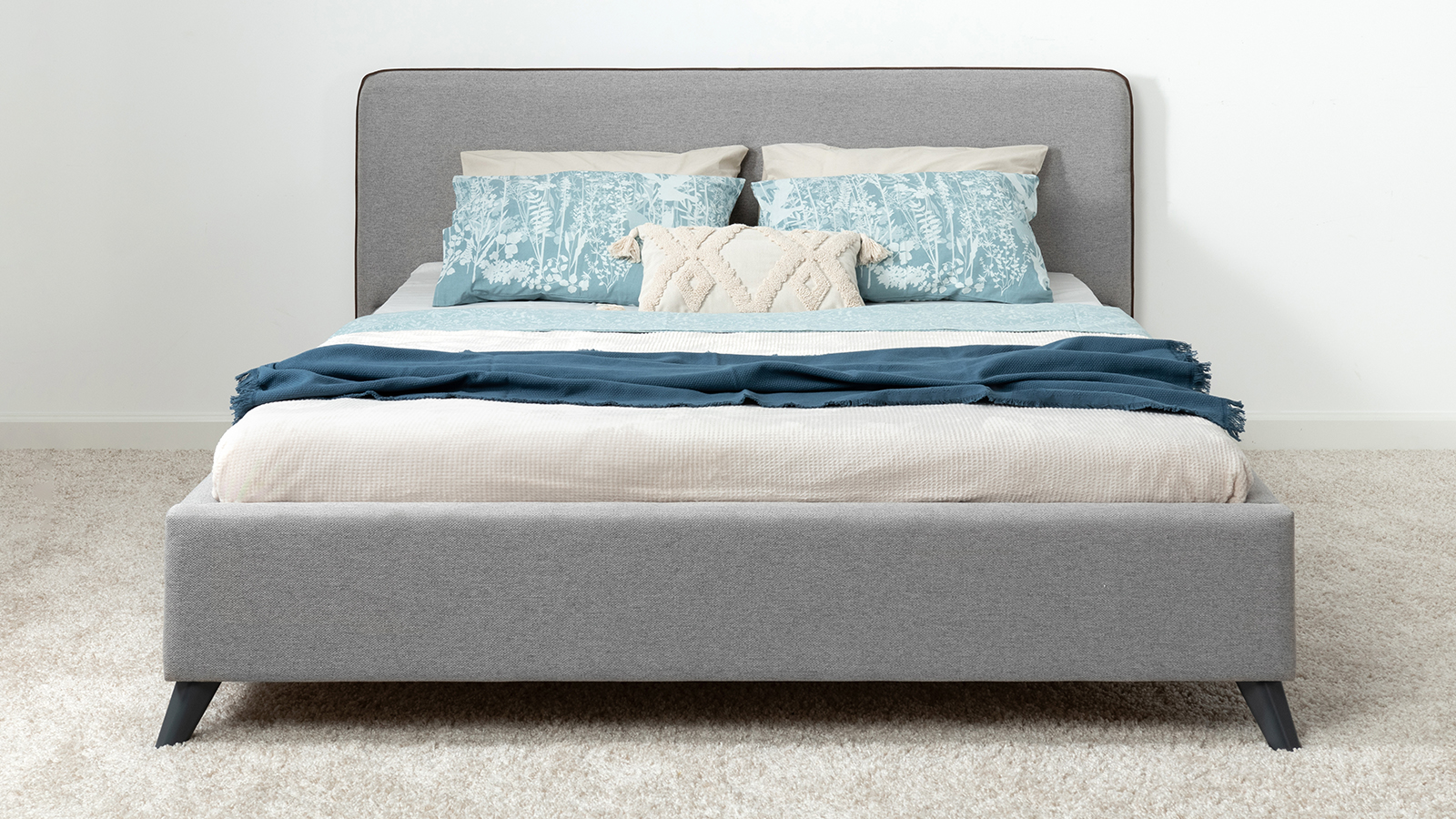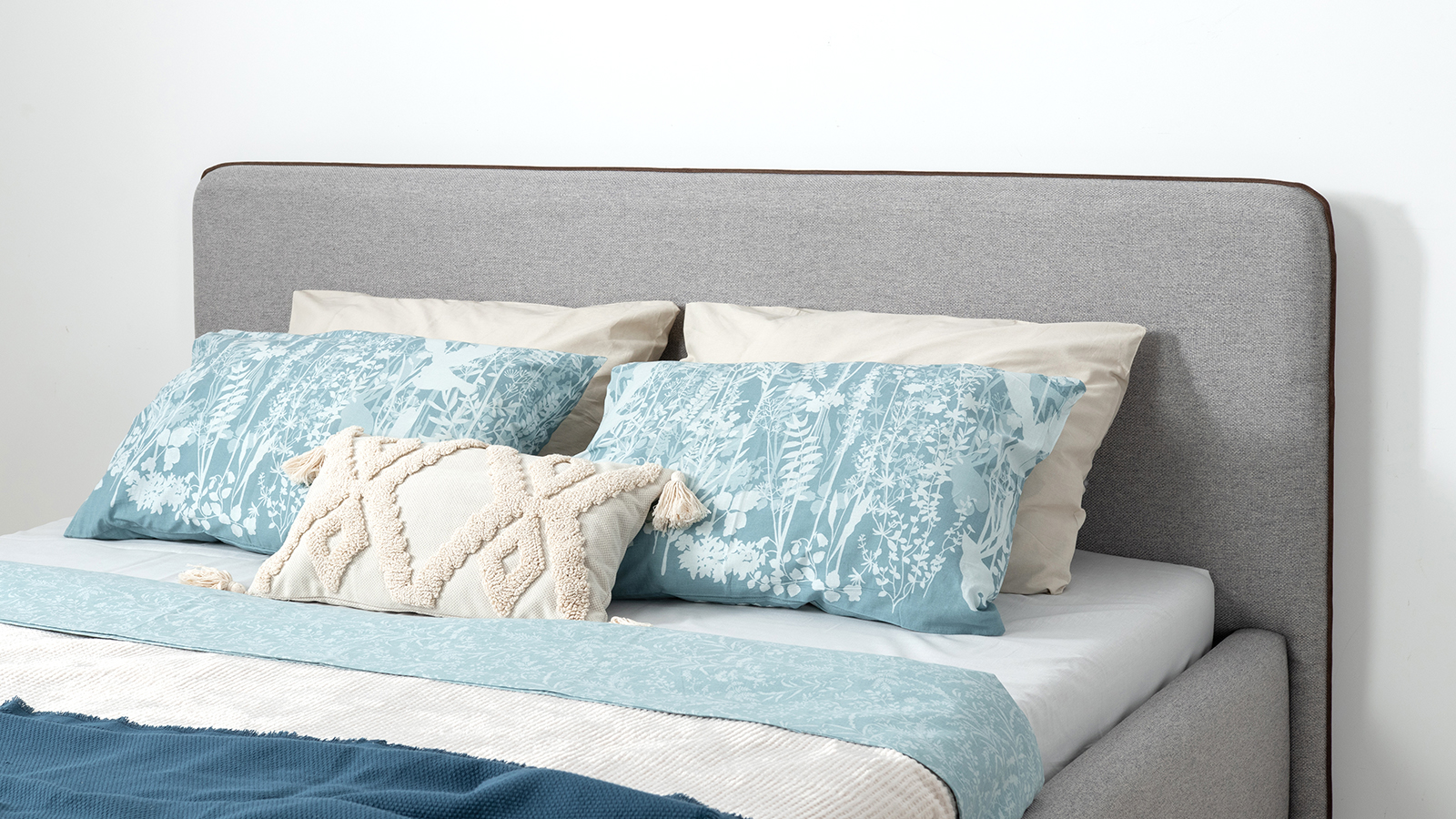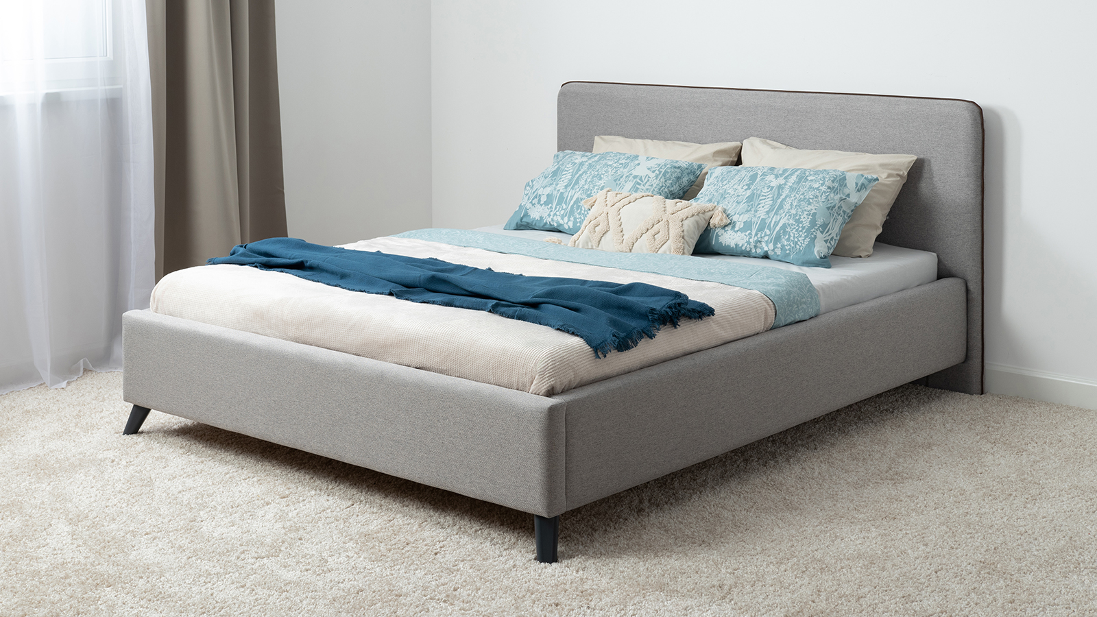 Кровать Миа 140 рогожка светло-синий, кант желтовато-коричневый с ортопедическим основанием и подъемным механизмом